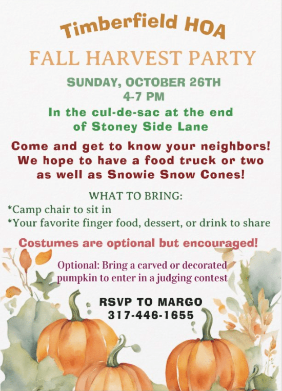 You’re invited to the Timberfield HOA Fall Harvest Party on Sunday, October 26th from 4–7 PM!